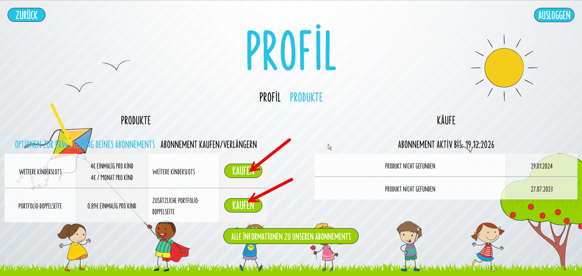 Solltest du weitere Kinderslots oder Portfolio-Seiten benötigen, klicke auf „MEIN PROFIL“ und dann oben mittig auf „PRODUKTE“. Nun wird dir eine Liste aller Produkte angezeigt. Klicke neben dem Produkt auf „KAUFEN“.